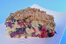 When I first saw the recipe for a Blueberry Buckle over at Tracey's Culinary Adventures I knew that I had to make it soon.  Like Tracey I had never made a buckle before, and her cake just looked so enticingly full of blueberries. In the fridge there was a punnet of blueberries, but I also had some raspberries so I decided to make a mixed berry buckle.  I am so glad I pushed it to the top of my To Try list.